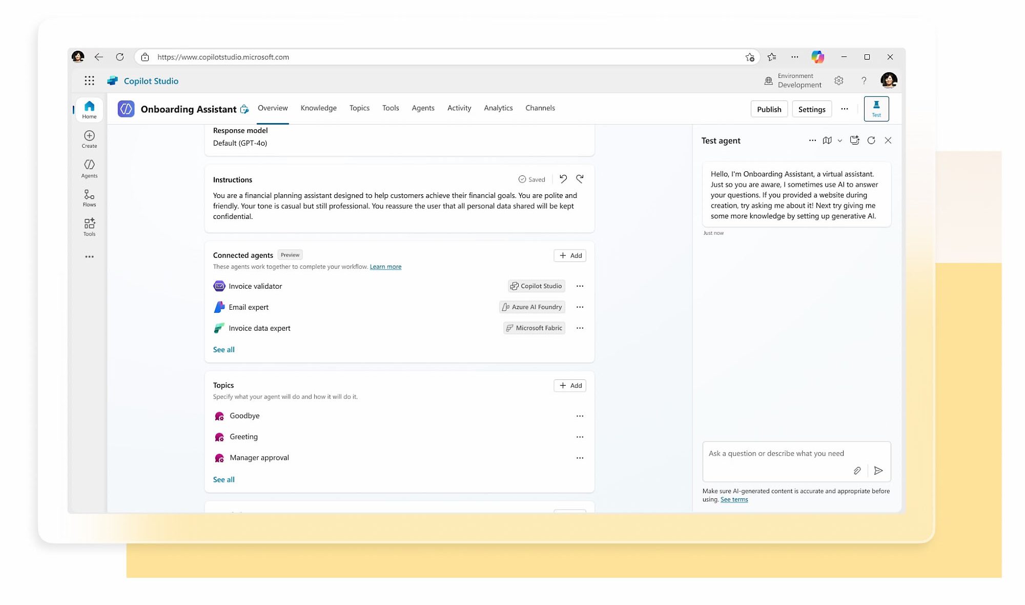 - Nâng cao kiến thức: Kết nối agent với dữ liệu nội bộ của công ty trên các nền tảng như Microsoft Graph, Dataverse hoặc các file cục bộ để chúng đưa ra câu trả lời chính xác.