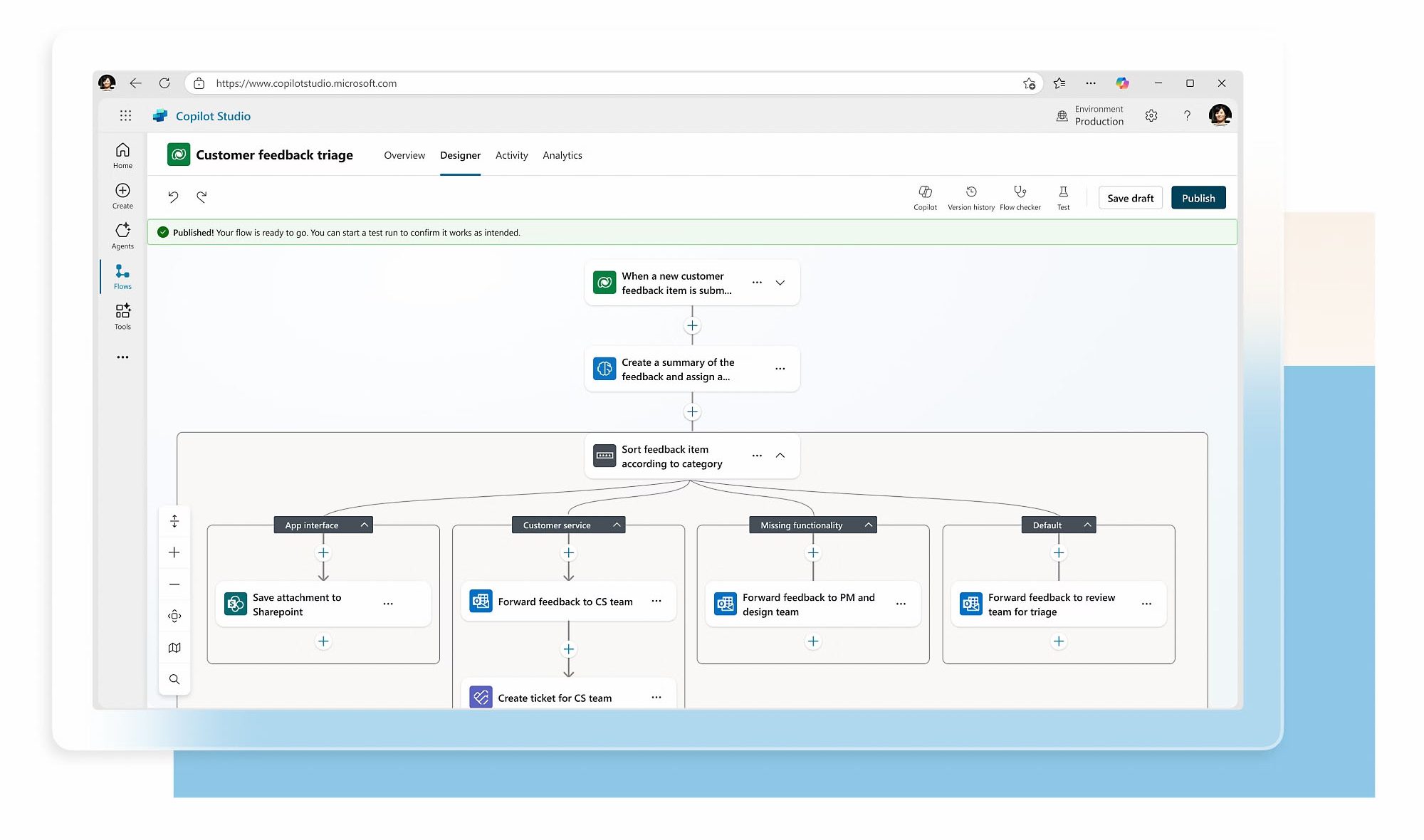 Agent flow là cách mạnh mẽ để tự động hoá các tác vụ lặp đi lặp lại và kết nối ứng dụng, dịch vụ của bạn. Agent flow có thể được kích hoạt theo nhiều cách: thủ công, bởi các sự kiện/agent khác, hoặc dựa trên lịch trình định sẵn.