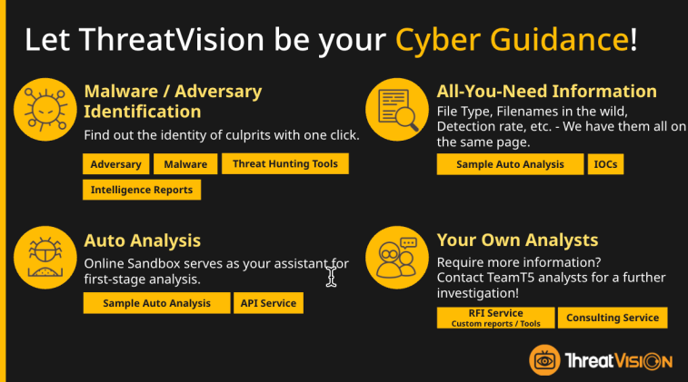 Với đội ngũ bắt nguồn từ các chuyên gia tham gia điều tra và ứng cứu sự cố, TeamT5 có đầy đủ thông tin về các kĩ thuật tấn công, các đội nhóm hacker, các sự cố an ninh mạng trên thế giới cũng như trong khu vực. Để có thể giúp đỡ khách hàng phát hiện sớm được các mối nguy đang nhắm vào tổ chức của mình, TeamT5 đã phát triển ra ThreatVision – Nền tảng cung cấp thông tin tình báo để đối phó sớm với các sự cố tấn công vào hệ thống. Vậy nền tảng ThreatVision có thể cung cấp những gì?