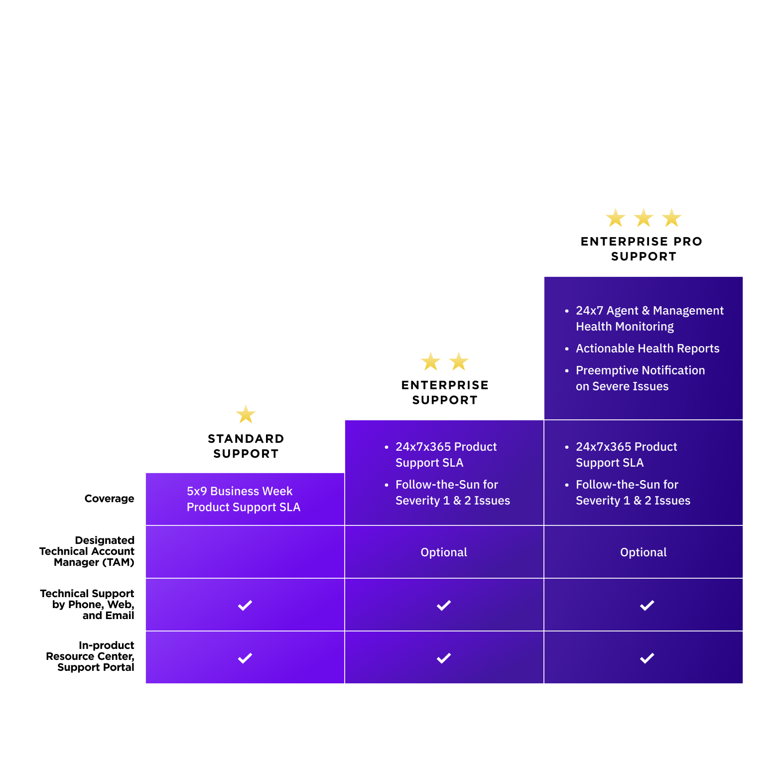 Mặc dù tất cả khách hàng đều có quyền truy cập vào các kênh hỗ trợ linh hoạt của chúng tôi với Hỗ trợ tiêu chuẩn, chúng tôi cũng cung cấp Hỗ trợ doanh nghiệp, Hỗ trợ Enterprise Pro và Quản lý tài khoản kỹ thuật được chỉ định (TAM) để đáp ứng nhu cầu riêng của mọi tổ chức, từ SMB đến các doanh nghiệp Fortune 10 trên toàn thế giới. khối cầu.