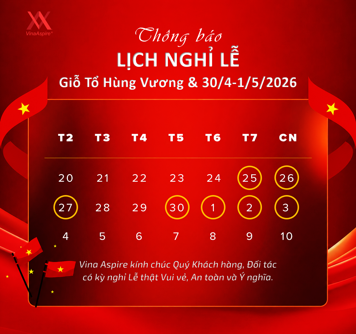 Kính gửi Quý Khách hàng và Đối tác, Vina Aspire trân trọng thông báo lịch nghỉ Lễ Giỗ Tổ Hùng Vương (mùng 10/3 âm lịch), Ngày Giải phóng Miền Nam…