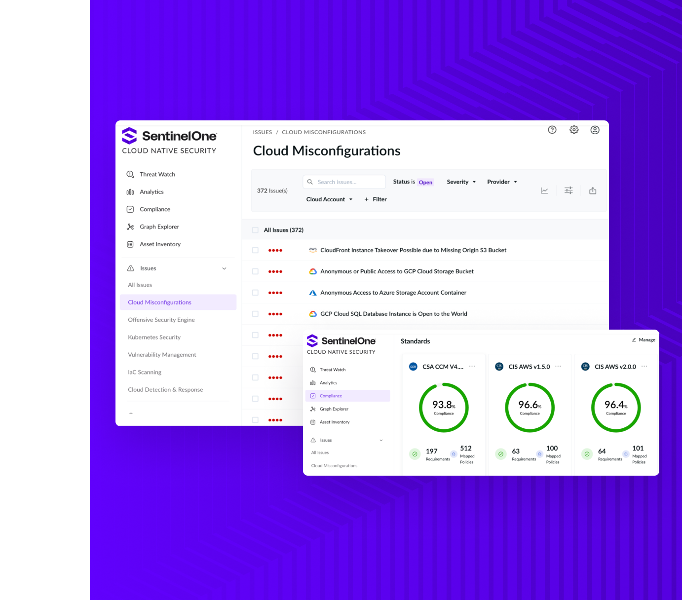 - Nhận điểm tuân thủ theo thời gian thực hiển thị nhiều tiêu chuẩn, bao gồm NIST, MITER và CIS, với bảng thông tin tuân thủ trên đám mây.